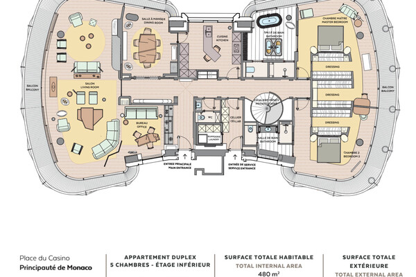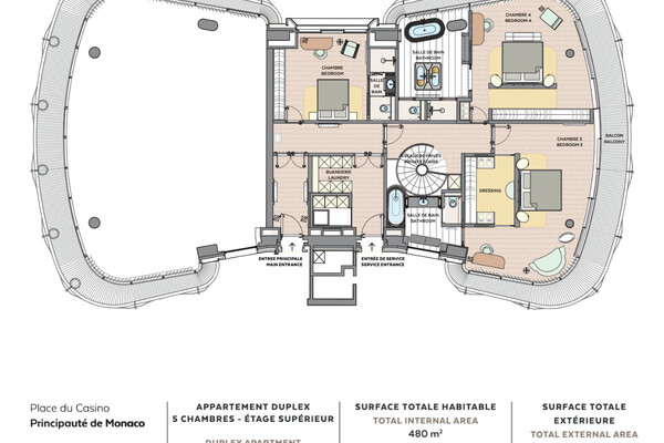 Grand duplex de 597m2 disponible en location meublée, à deux pas du Casino avec une vue panoramique.